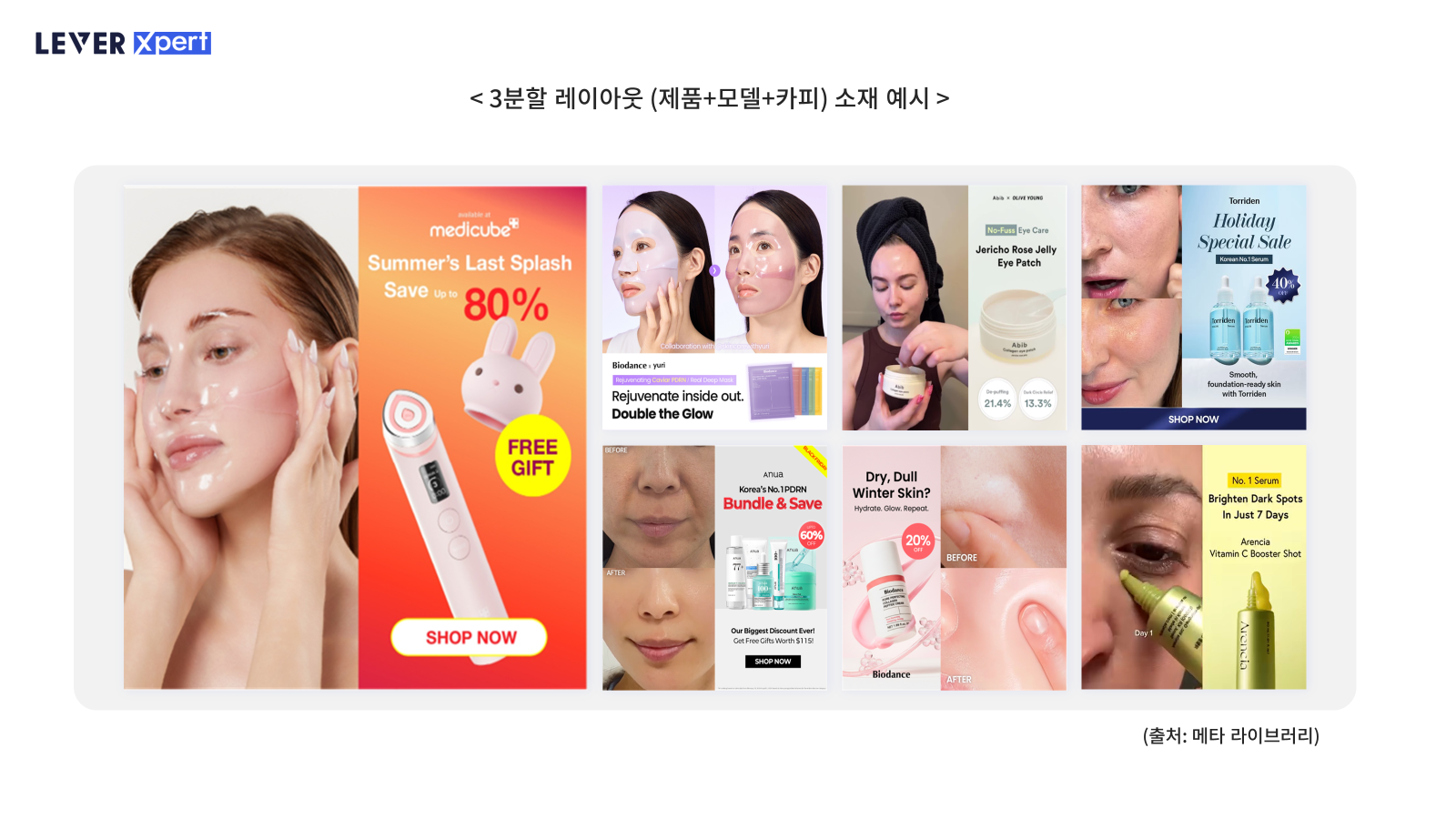 여러 K-뷰티 브랜드의 상위 소재를 비교해보면, 제품 디테일·사용 장면·핵심 메시지를 한 화면에 병렬로 구성하는 3분할 포맷이 높은 빈도로 등장합니다. 이 방식은 단 3~4초 만에 제품의 제형, 사용법, 비포&애프터 효과까지 직관적으로 전달할 수 있어 정보 밀도 대비 설득력이 강한 구조입니다.