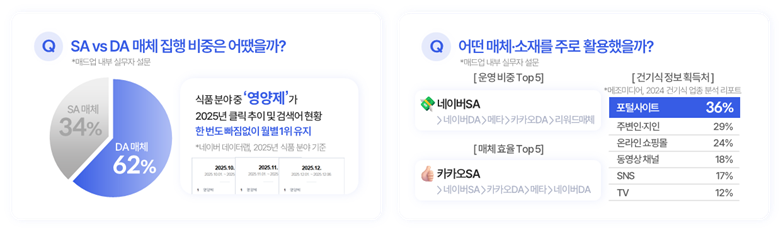 건기식 업종은 타 업종과 달리 증상·성분 기반 검색이 구매의 출발점이 되는 대표적인 '의도 기반 시장'입니다. '피로 회복', '밀크씨슬 간 건강' 처럼 해결하고 싶은 문제를 먼저 인식하고 검색으로 진입하는 구조이기 때문에, 실제 데이터에서도 SA 비중이 다소 높게 나타났습니다.