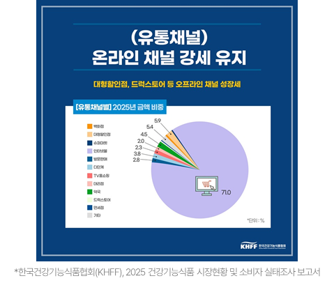 또한, 건기식 시장 유통 구조에서는 온라인 채널의 강세가 두드러지는데요. 인터넷몰이 전체 구매 채널의 약 70%이상을 차지하며, 소비자들이 손쉽게 가격을 비교하고 구매할 수 있는 온라인 쇼핑을 중심으로 건기식 소비가 이뤄지는 것으로 나타났습니다.