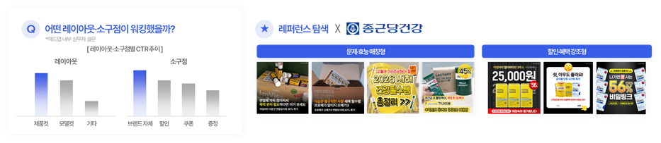 건기식은 성분·효능과 같이 판단 기준이 비교적 명확한 카테고리인 만큼, 화려한 연출보다 제품 정보가 선명하게 드러나는 제품컷 중심 소재에서 높은 효율이 나타났습니다. 특히 할인·쿠폰 소구보다 브랜드 자체 메시지에 대한 반응이 더 강하게 나타난 점은, 구매자가 빠르게 이해할 수 있는 정보 전달을 우선시한다는 소비 특성을 보여줍니다.
