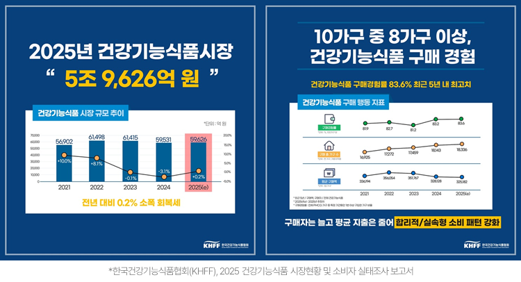 한국건강기능식품협회(KHFF)에 따르면 2025년 국내 건강기능식품 시장 규모는 약 5조 9천억원, 구매 경험률은 약 83%에 달해 국민 10가구 중 8가구 이상이 건기식을 구매한 것으로 나타났습니다.