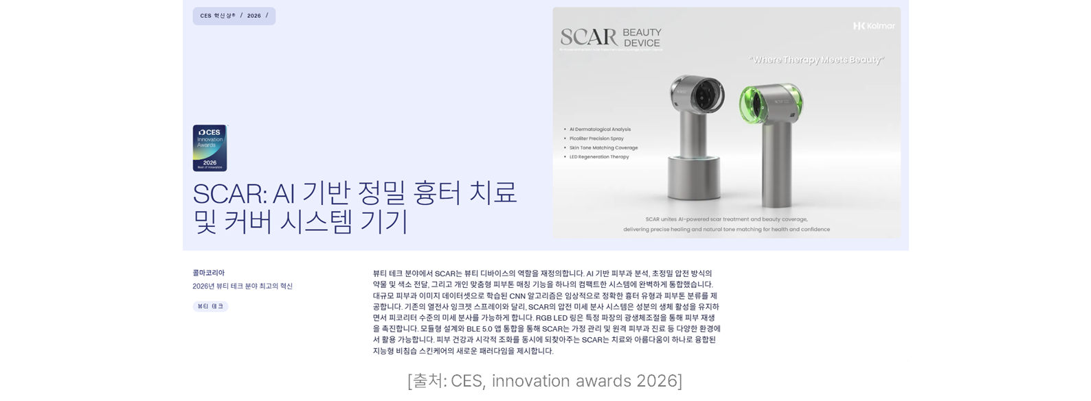 놀라운 점은 여기서 끝이 아닌데요. 이후 피부 톤과 질감에 맞추어 흉터 부위를 자연스럽게 가려주는 맞춤형 메이크업까지 한 번에 구현한다는 점입니다. 진단-치료-미용으로 이어지는 원스톱 구조는 뷰티 테크가 나아가야 할 궁극적인 지향점을 제시하며 CES 혁신상을 거머쥐었습니다.