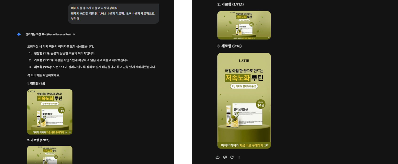 메타, 구글, 네이버 GFA 등 다양한 매체에서 소재를 활용하려면 각 매체별 규격에 맞는 리사이징은 필수인데요. 이제는 이미지 비율 역시 프롬프트 한 번으로 쉽게 변경할 수 있습니다. 비율만 대략적으로 요청해도, 각 사이즈에 맞게 구성 요소를 재배치해주기 때문에 포토샵을 직접 열어 수정할 일이 확실히 줄어들 것으로 보입니다.
