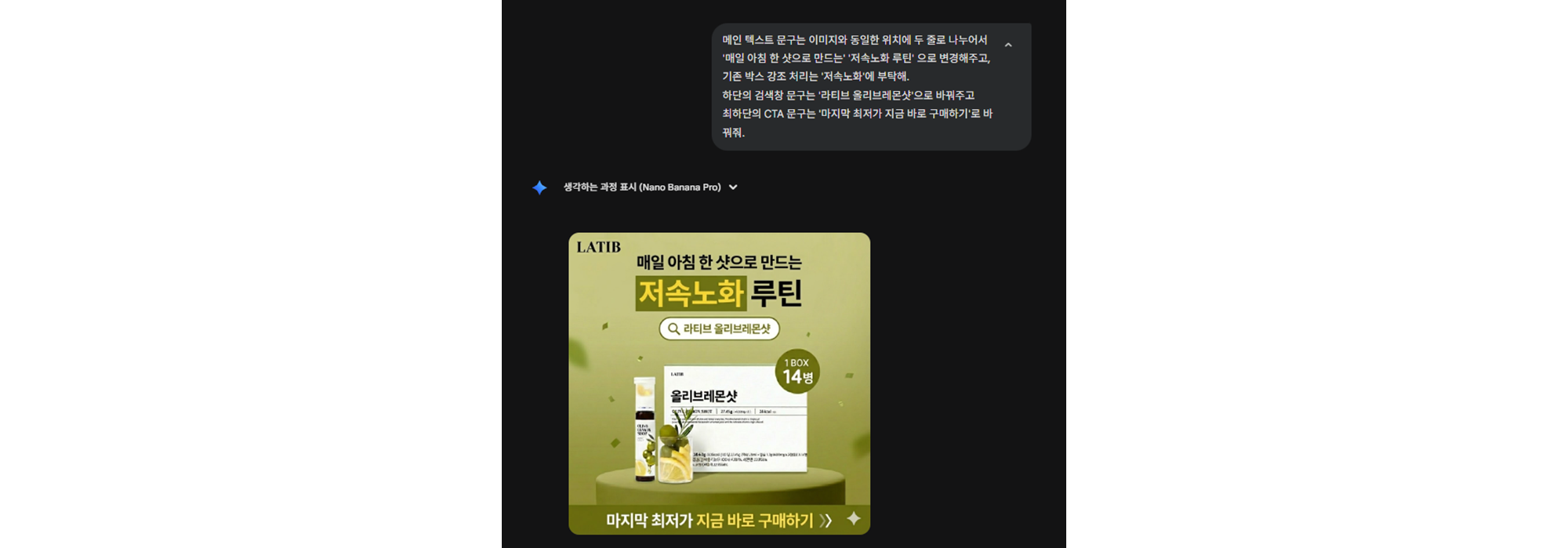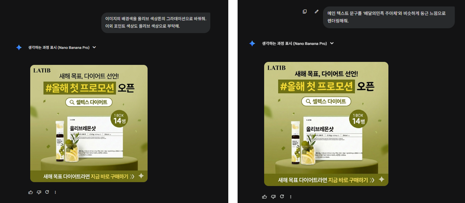 텍스트 역시 원하는 문구를 그대로 입력하면 비교적 정확하게 변경됩니다. 기존 강조 효과나 레이아웃도 함께 유지되는 점이 인상적입니다. 카피만 바꾼 여러 버전을 빠르게 생성해 메시지 A/B 테스트용 소재를 제작하는 데에도 활용도가 높아 보입니다.